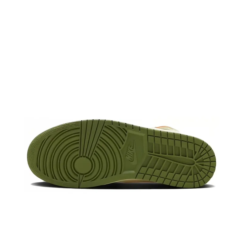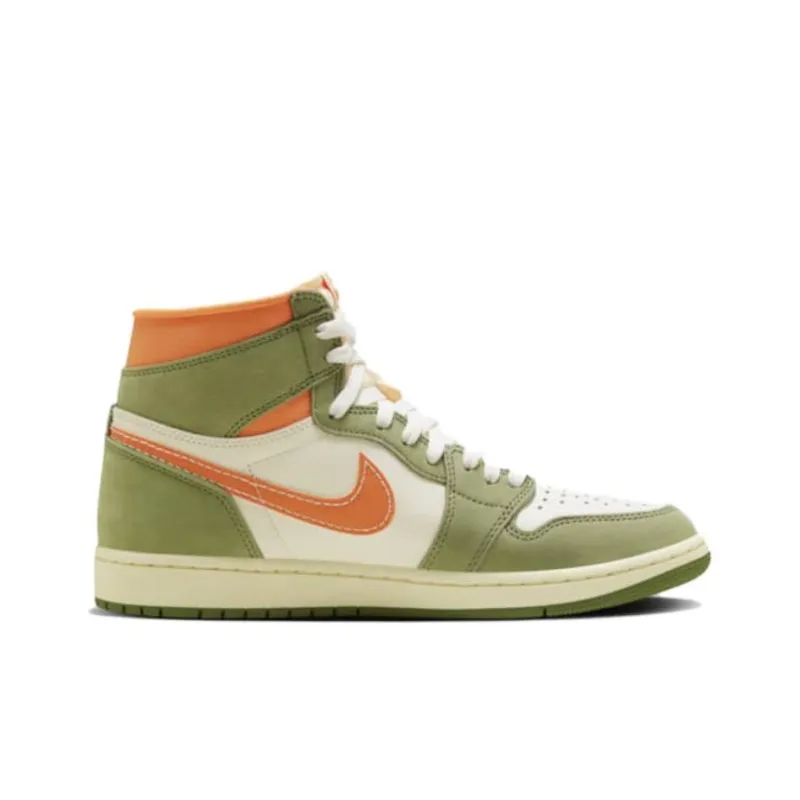 The Air Jordan 1 Retro High OG ‘Craft – Celadon’ features a white leather upper with olive green suede overlays at the forefoot and heel. Vibrant hits of Bright Mandarin settle on the padded high-cut collar, interior lining and signature Swoosh, the latter enlivened with white contrast stitching._x000D_