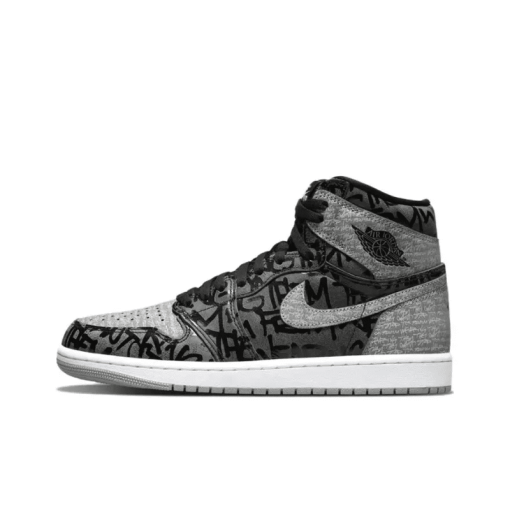 The Air Jordan 1 Retro High Rebellionaire draws inspiration from the original Air Jordan 1 Shadow with its simple black and grey color-blocked upper. Printed on leather construction, the graffiti-style text covers the upper. At the base, a white and grey Air sole completes the design._x000D_