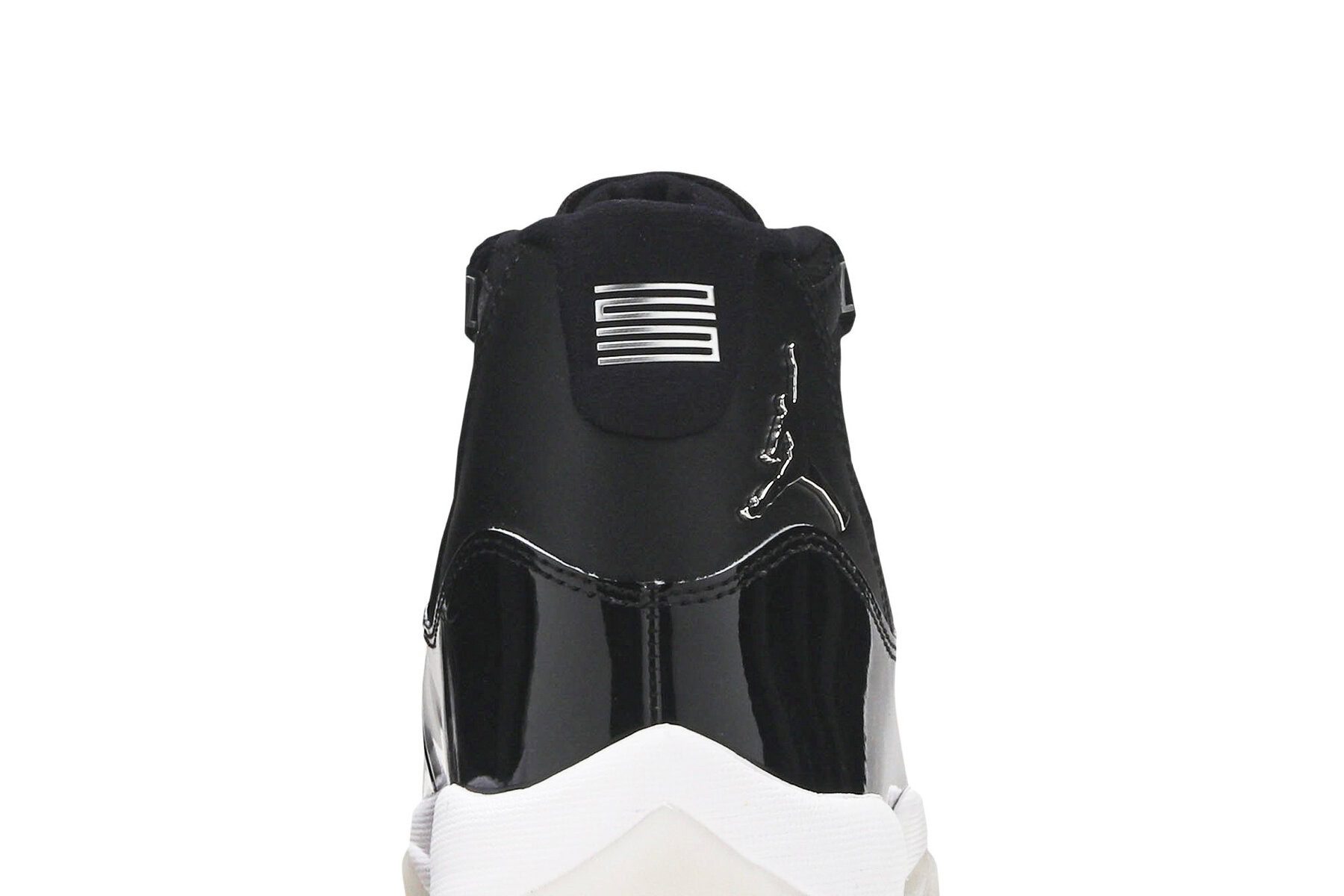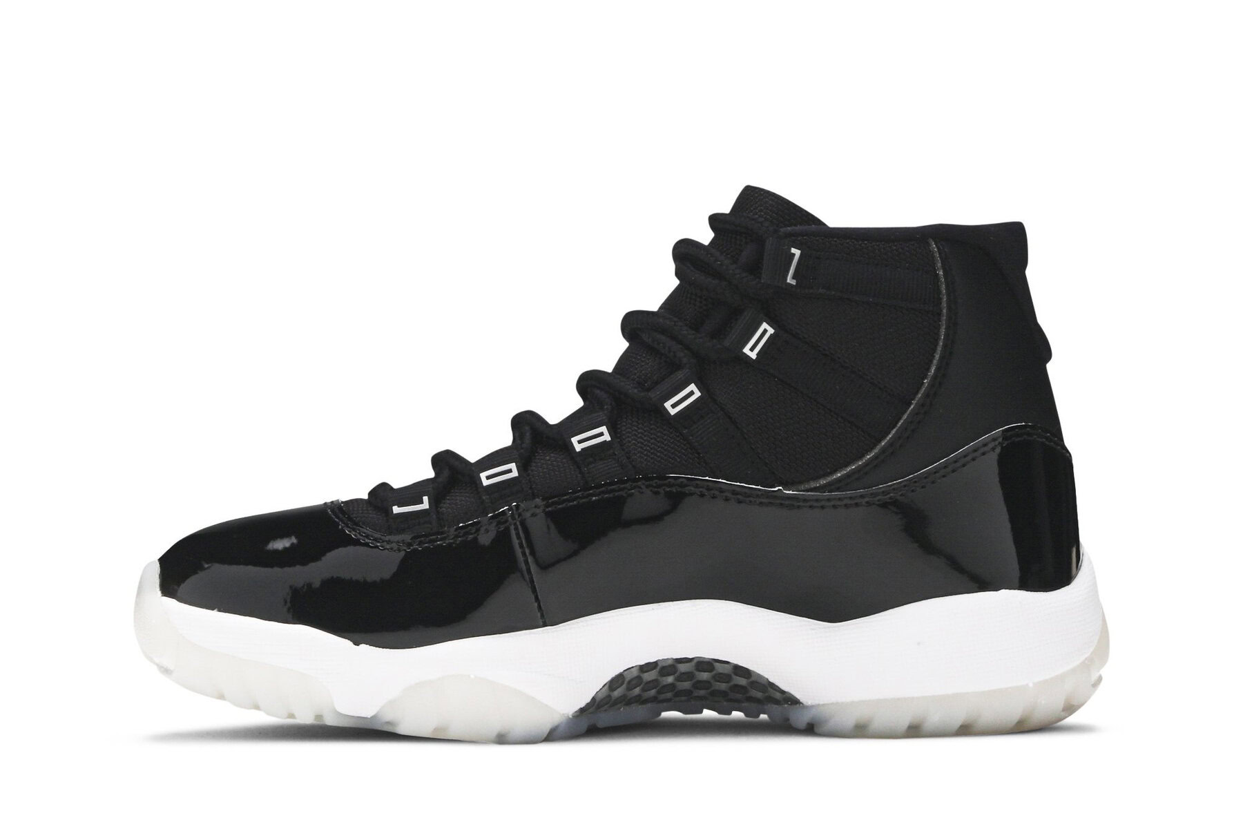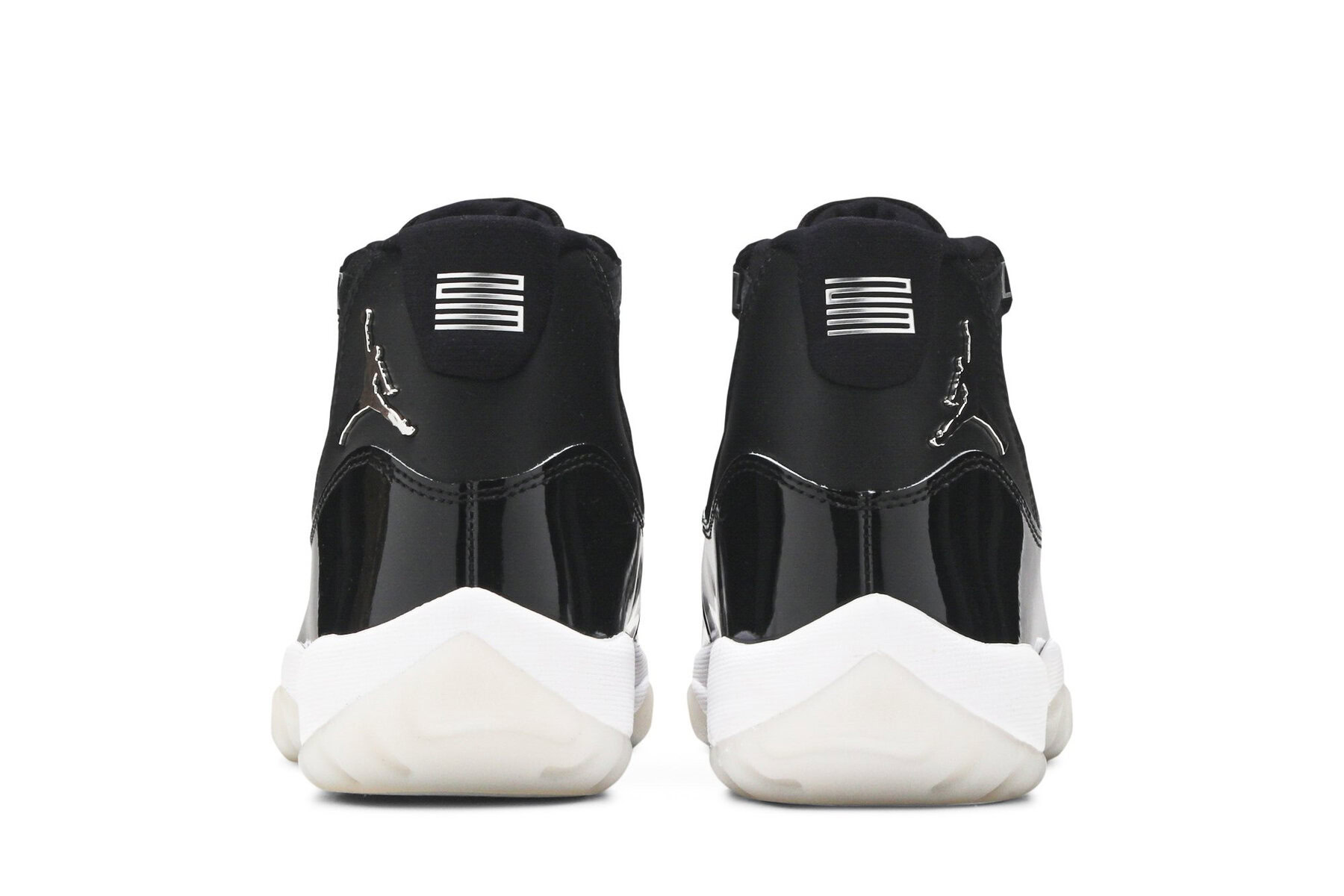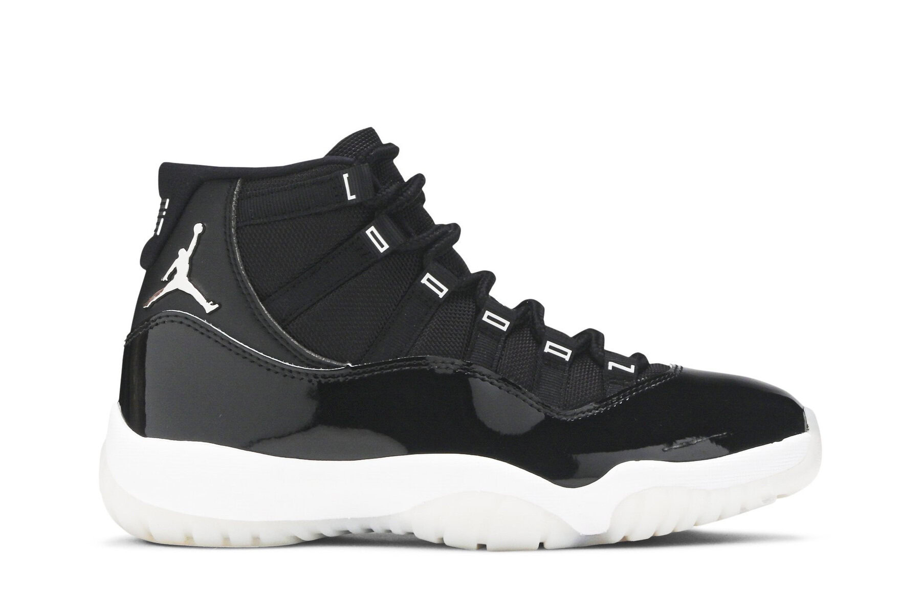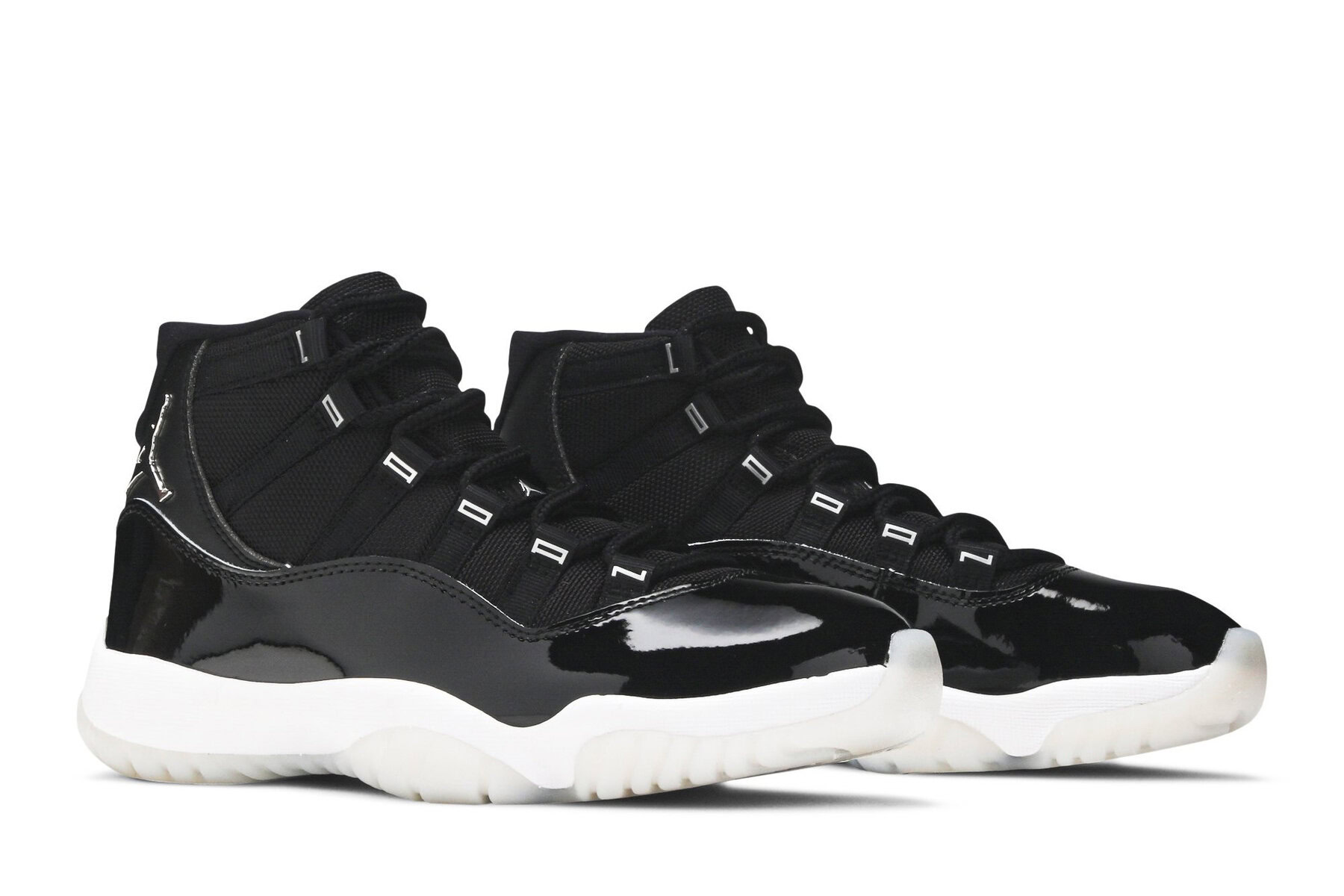 The womens Air Jordan 11 ‘Jubilee’, also known as the Air Jordan 11 25th Anniversary, celebrates the classic silhouette’s quarter-century birthday with a monochrome black finish throughout the upper, constructed from a traditional blend of ballistic mesh and patent leather._x000D_