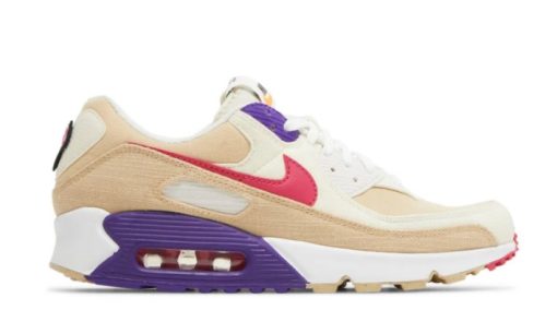 The Air Max 90 ‘Air Sprung’ enlivens the retro running shoe with vibrant colors and playful details. The upper is crafted from Sesame canvas with cream-colored synthetic leather overlays, molded purple eyelets, and a signature Swoosh in Rush Pink.