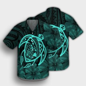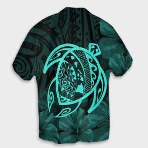 Hawaiian Map Turtle Kanaka Hibiscus Hawaiian Shirt – Turquoise- For men and women – Fanshubus