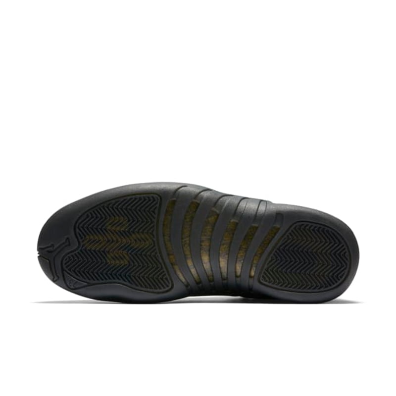 The glossy black midsole wraps around the foot for structure, while the herringbone-patterned outsole ensures secure traction. A stitched “Jumpman” tongue and heel tab branding complete the signature AJ12 silhouette.