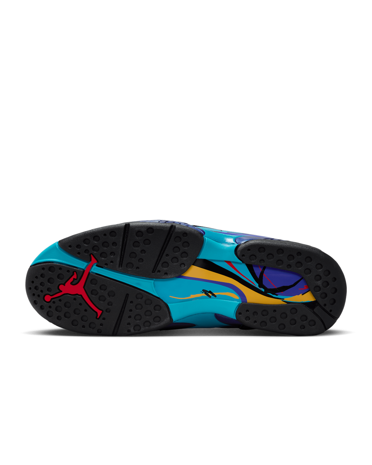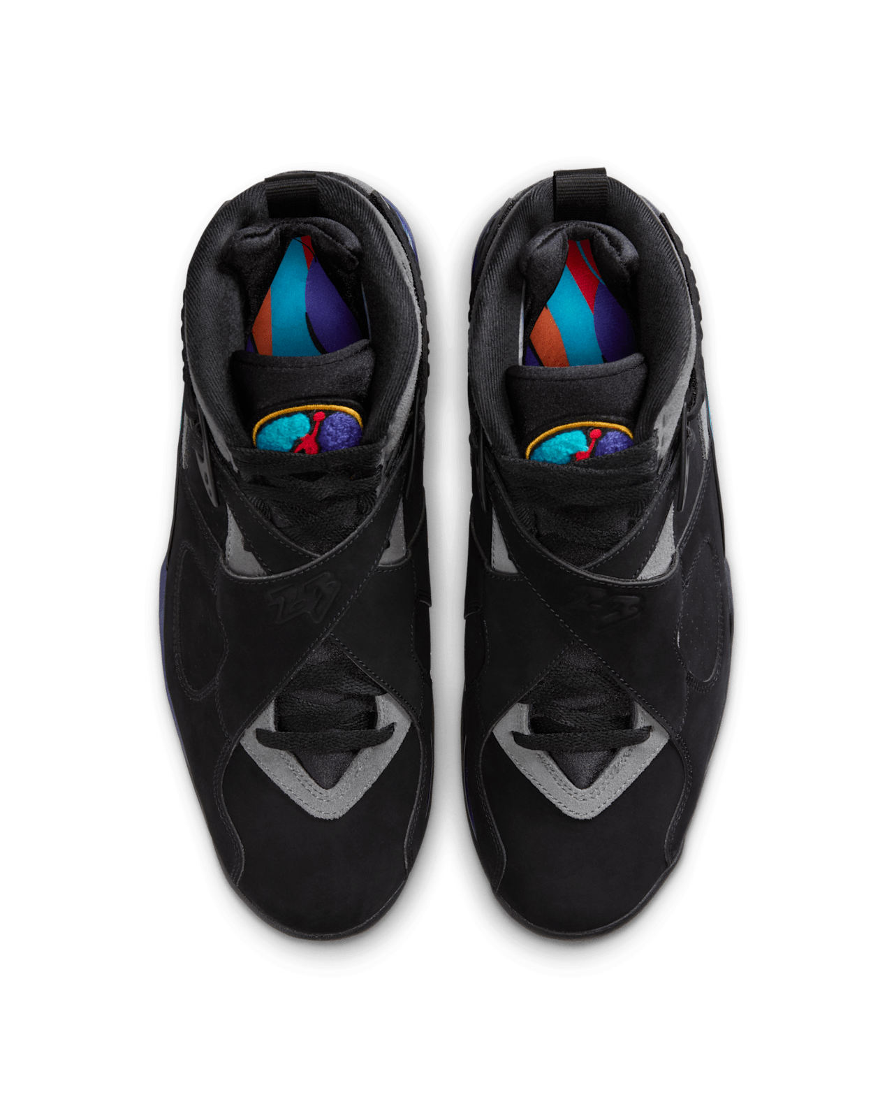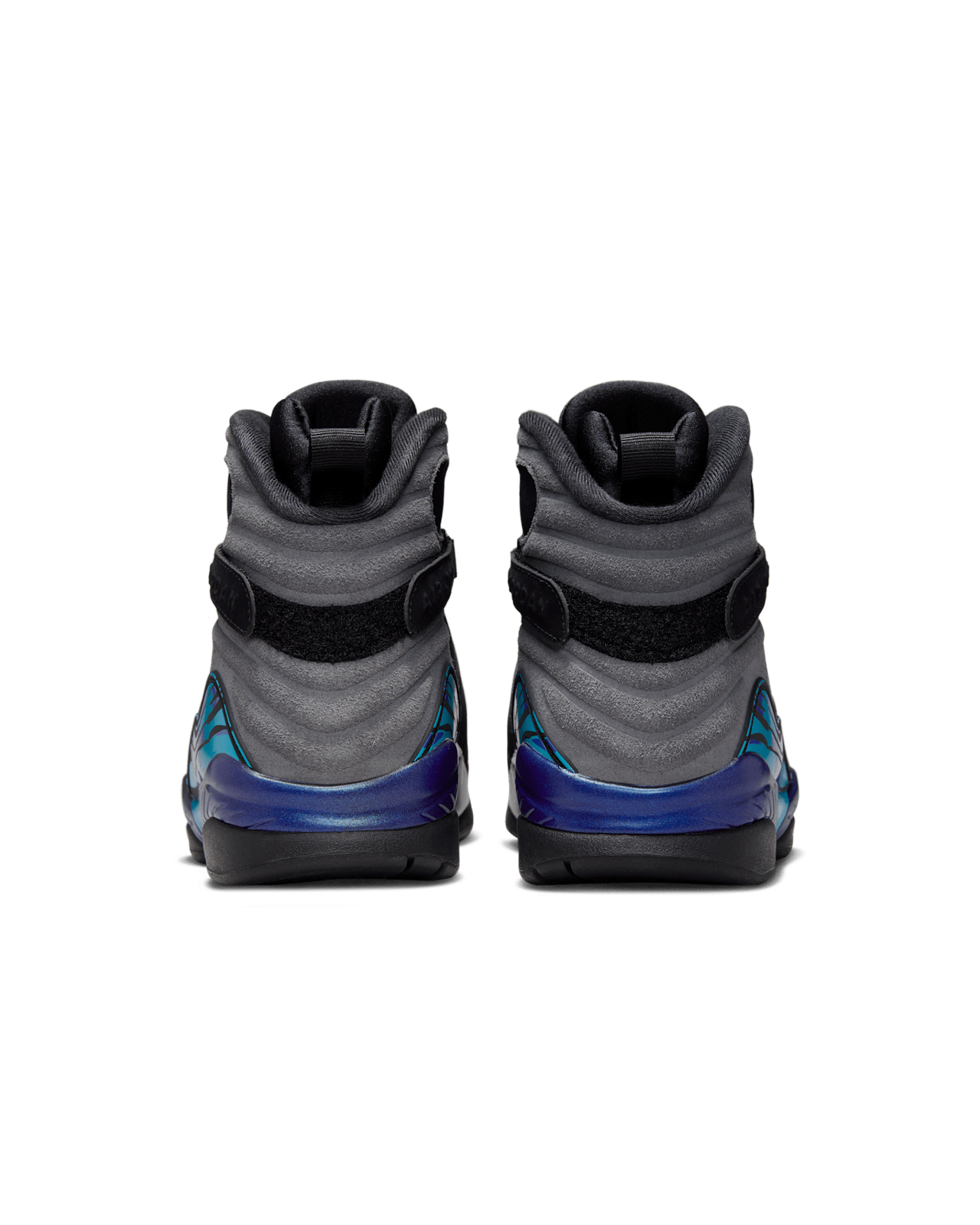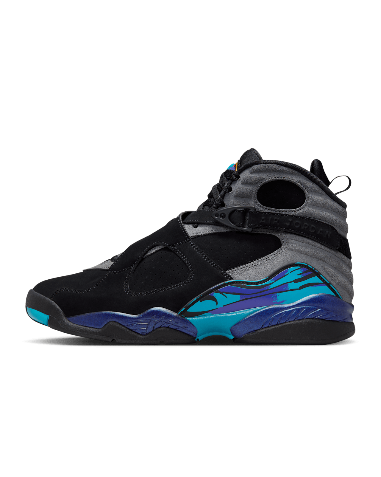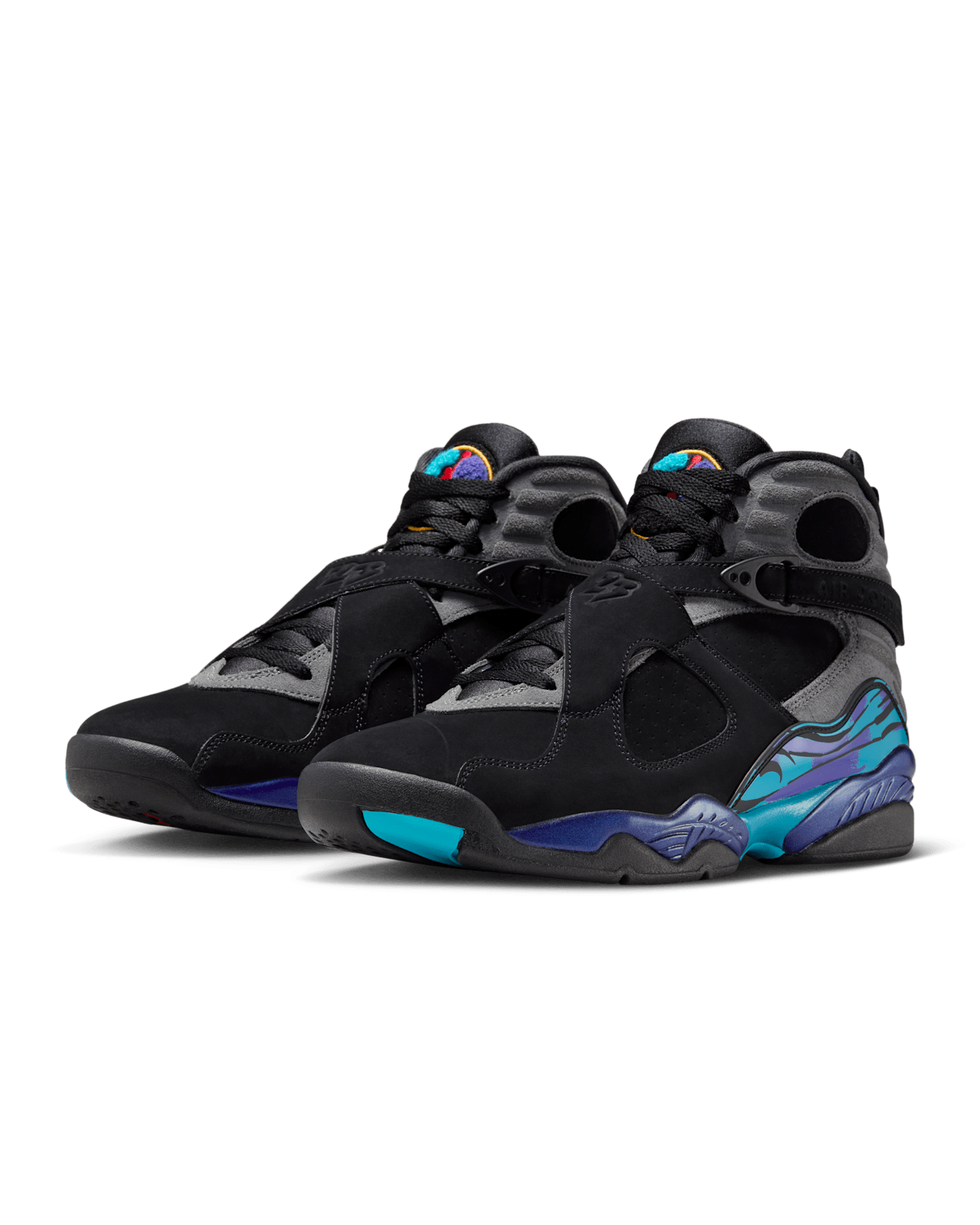 🔥 The upper features rich black nubuck that delivers both durability and a sleek aesthetic, serving as the perfect backdrop for the brilliant aqua and concord splashes along the midsole. The chenille Jumpman patch on the tongue returns with its textured, high-impact look, adding dimension to the silhouette. The midfoot cross-straps—one of the defining traits of the Jordan 8—provide secure lockdown and a supportive ride, while the internal bootie construction creates a snug, glove-like fit ideal for basketball-inspired movement or all-day wear.