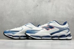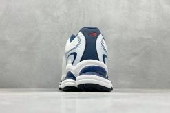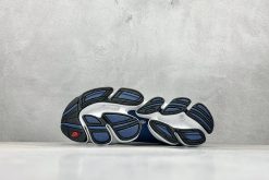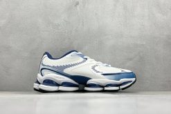 This futuristic model boasts a streamlined, minimalist upper in white tones, paired with deep navy accents to create visual contrast and modern flair. The breathable mesh and structured overlays nod to archival performance models while positioning the silhouette squarely in today’s fashion-forward scene.