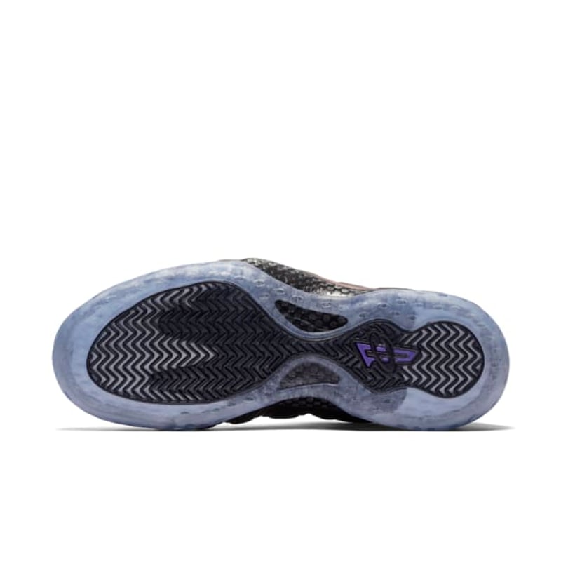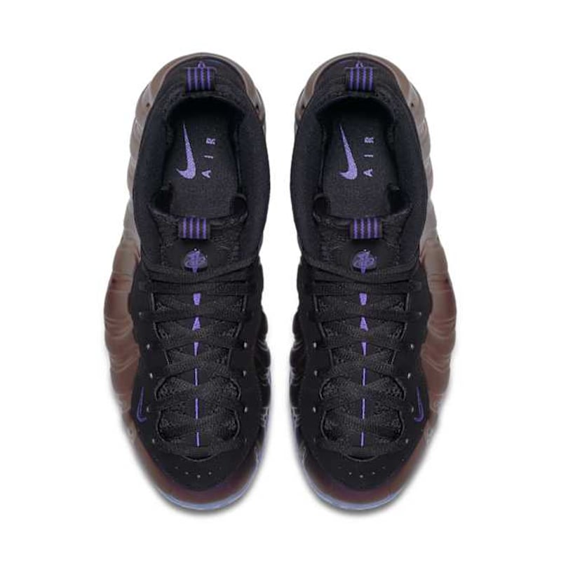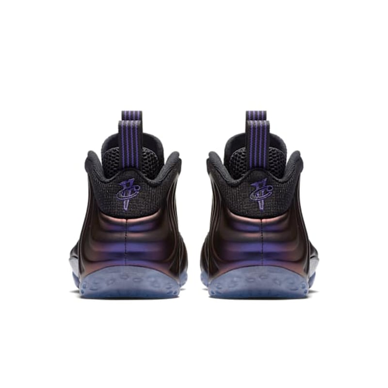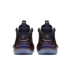 The sneaker’s upper features a molded Foamposite shell in iridescent Eggplant Purple, shifting in color under light. Complementing this bold look is the black nubuck eyestay, mesh tongue, and inner bootie that offer snug lockdown and breathable support.