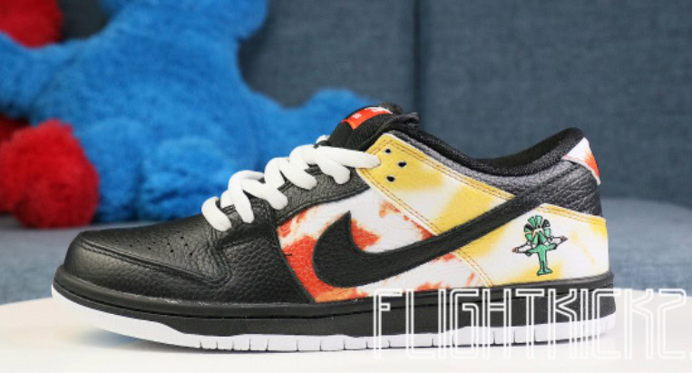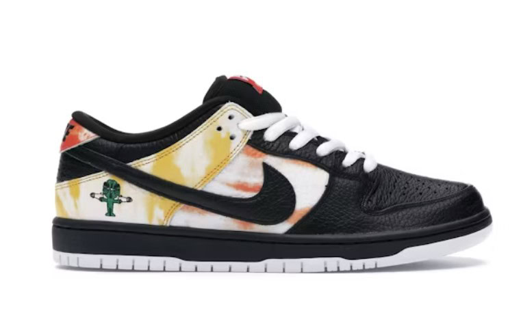 The Nike SB Dunk Low Raygun Tie-Dye Black 2019 offers a striking alternative to its white counterpart with a darker, more intense color scheme. Featuring a black leather upper adorned with a colorful tie-dye pattern, this sneaker exudes a bold and edgy aesthetic. The tie-dye details are highlighted by a contrasting Raygun graphic in vibrant hues, which adds a retro flair reminiscent of the original Raygun design. The black midsole and translucent outsole further enhance the sneaker’s visual appeal while ensuring comfort and durability. With its unique blend of dark tones and vibrant tie-dye, the Raygun Tie-Dye Black is a standout piece for collectors and fans of bold, artistic sneaker designs.